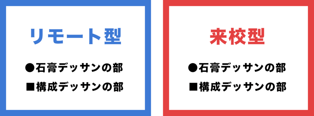 会場に来なくても参加可能な「リモート型」or「来校型」から参加方法が選べます。ともに「石膏デッサンの部」or「構成デッサンの部」をご用意しております。